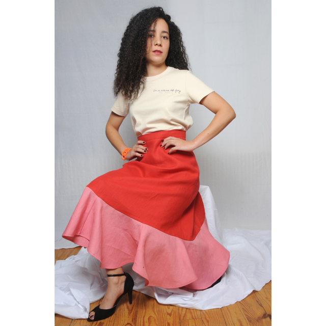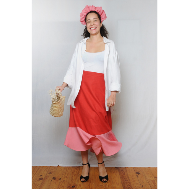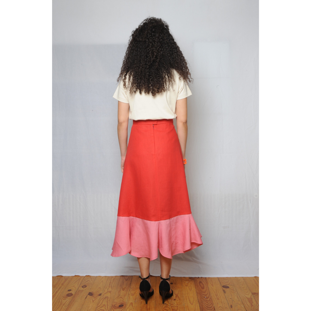 The Red Pink version of La Jupe HIBISCUS is made of linen. Both fabrics are sourced from deadstock of a couture house.